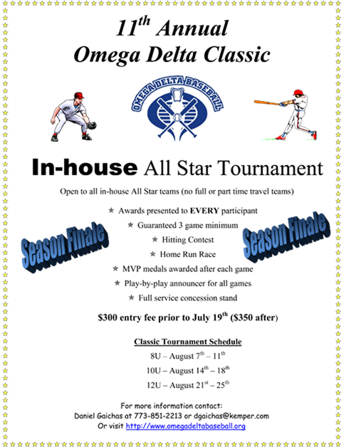 Thank you for visiting Omegadeltabaseball league's tournament page. All the information you need will be posted on this page. Please visit us on a regular basis for news and updates pertaining to our tournament.